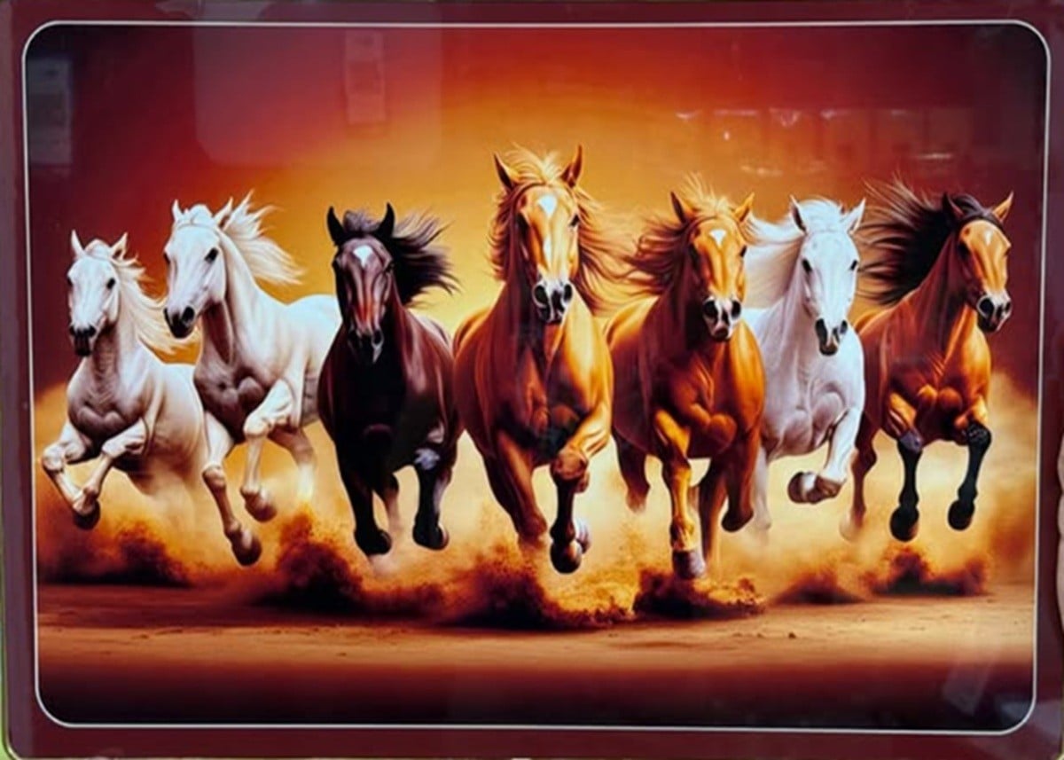 अंक ज्योतिष और हिंदू धर्म में 7 की संख्या को बेहद शुभ माना जाता है। जैसे इंद्रधनुष के सात रंग, सप्तर्षि और सात फेरे आदि। घोड़ों को सौर ऊर्जा का प्रतीक है, जोकि सूर्य के रथ से भी जुड़ा है। दौड़ते हुए घोड़ों की तस्वीर लगाने से जीवन में कभी न रुकने वाली सफलता को दिखाते हैं।